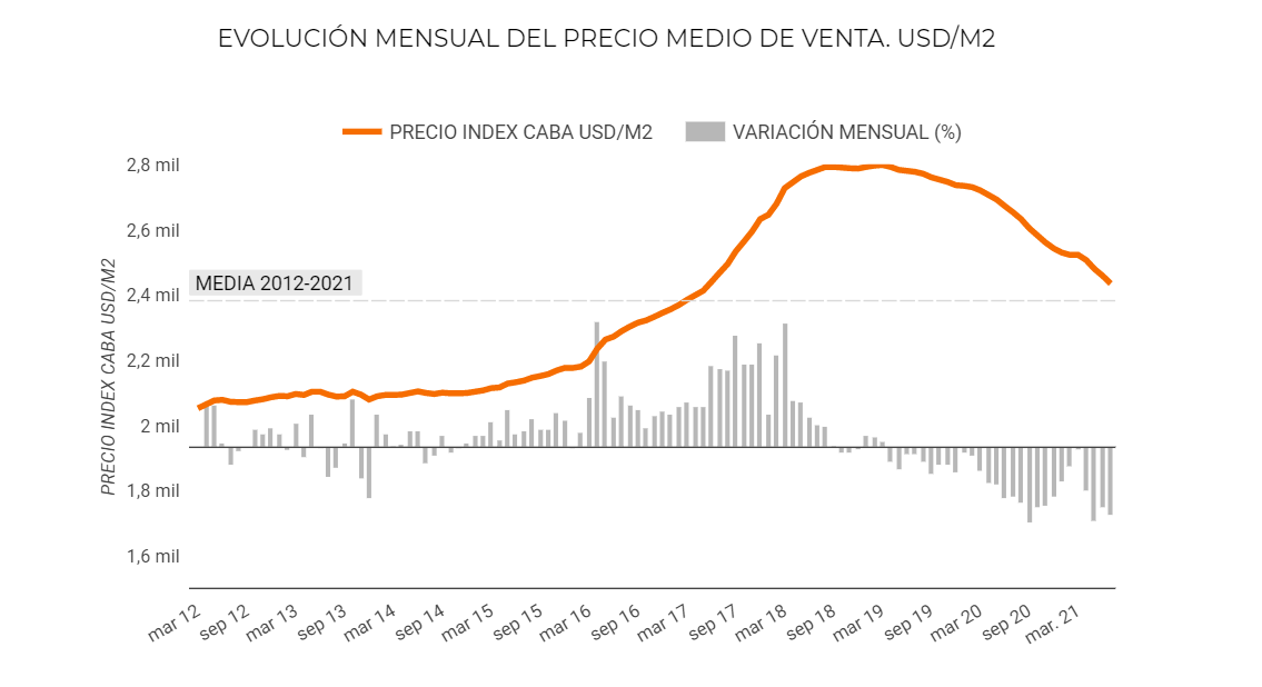 Este segundo grafico muestra la continuación del grafico anterior: muestra la evolución del periodo 2012-2021: contrario a la caída abrupta del año 2001, desde su máximo registrado en el año 2019 se produjo un amesetamiento producto directo de la pandemia covid-2019, que paralizó todo el mundo. No existió caída porque no existieron propietarios endeudados obligados a liquidar sus inmuebles.