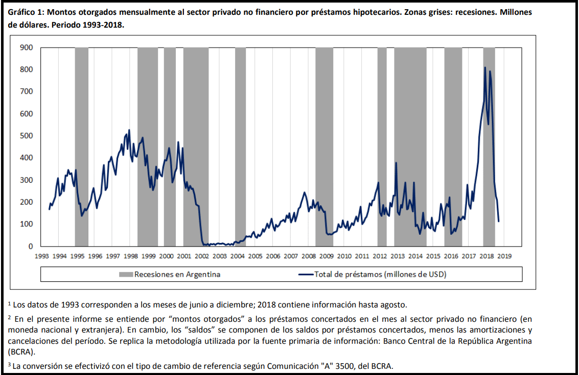 El stock de hipotecas respecto del PIB en Argentina, es decir, la cantidad de créditos otorgados en relación a la producción total del país, no superó el 2% aun durante la década del 90. Mientras que el promedio de la región (Latinoamérica) ronda el 8% y el promedio en los países desarrollados es el 60%, en Argentina prácticamente es inexistente; se puede deducir entonces que en Argentina no hay Mercado de hipotecas.